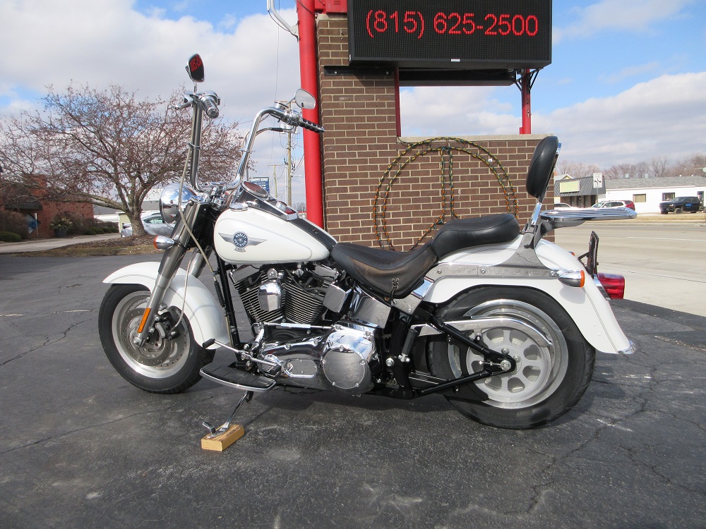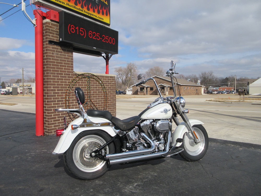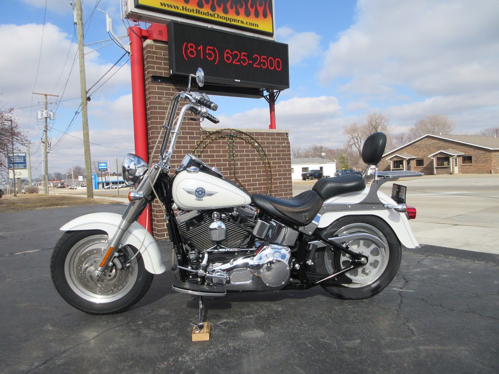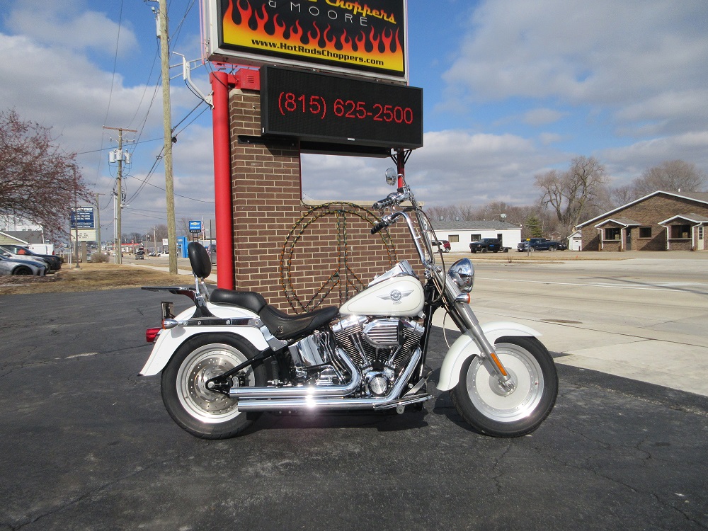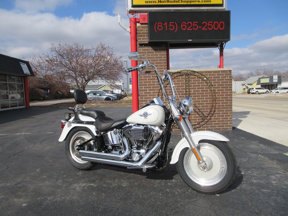 The Fat Boy is a V-twin Softail cruiser with solid disc wheels that was designed by Willie G. and Louie Nets for Harley Davidson. Prototypes were released at Daytona Bike Week in both 1988 and 1989 and it was finally put into production and released as a 1990 model. The name is derived from the fact that it is wider than most bikes when viewed head on. In 2000 a new 88” Twin Cam engine was used which required some minor changes to be made to the frame. In 2002 bullet style indicators were added. For Fat Boy’s 15th Anniversary Harley used the counterbalanced Twin Cam 88B in 2005. This particular example was optioned in Glacier White Pearl and has been upgraded with a Stage I billet air cleaner and it sounds just plain nasty ripping through its Vance & Hines Big Shots staggered exhaust. Other upgrades include the 14” ape hangers, a passenger backrest with luggage rack and nice list of chrome upgrades which include the levers, switch housings, switches, grips and a rear fender tip. It was serviced within the last 3,000 miles at which time it received a new rear tires and brakes and we just had a new front tire installed and everything works as it should. There are over a couple of thousand dollars’ worth of options on this beauty yet we have priced her as if she were bone stock so if you like what you see we suggest that you reach out before someone beats you to it!