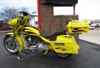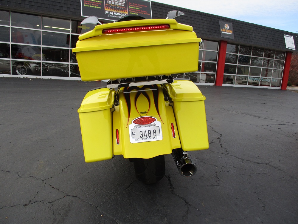 Gary Chipp, founder of Fat Baggers Inc. (FBI) and his family have been in the motorcycle industry since 1973 and a franchise Harley Davidson dealer since 1984. FBI evolved from customer requests as they were looking for a way to get more rubber under their baggers. Gary fabricated the parts needed to install a wide tire on a friend’s bagger. As soon as the bike hit the road the requests started pouring in. It soon became evident that there was a market for a new business and FBI was born. They have been the manufacturer of high end custom motorcycles and parts for over 20 years now. The Razorback features a drop seat design with a low 24” seat height, a 17” RC Components chrome rear rim sporting a 200mm rear tire, a matching 21” front rim and a 35 degree rake which is perfect for the larger front rim. It is a high end build and everything is chrome including the H-D inner primary, 6 speed transmission and the single sided front end. Arlen Ness provided a long list of parts including the mirrors, levers, pegs, pedals and more. There is a chopped tour pak with a spoiler that houses a brake / running light, a custom stitched seat with a matching passenger pad, Arnott rear air ride with upgraded chrome shocks, Dakota Digital gauges, 12” Monkey Bars and too much more to list. The heart of this machine is a Harley-Davidson 103” Twin Cam that was removed from a new 2013 FLHX with 11 miles and properly packed and stored. It was professionally installed on this bike 10 years later in June of 2023 when the bike had 25,118 miles. During the installation a leak down test was performed, it was dyno tuned and a new Sharkroad 4” 2-into-1 exhaust was installed that sounds just plain nasty. When the engine was installed it also received new bearings, a new compensator, all new gaskets, fluids and filters. It just received a complete service at 26,892 miles including all gaskets, fluids and filters. After thoroughly servicing it we installed a top of the line Diamond Audio 6 speaker 1100 watt sound system which is controlled by their new state of the art MSHD9813SG head unit that not only changes the whole look of the inner fairing but also enables the amplifier to perform at its peak to bring you heart pounding sound. Everything is in perfect working order and nothing is in need of attention. We have found similar bikes with stock H-D stereos and smaller engines being listed for $25K and up. This one has a bigger engine from a 2013 that actually only has 3,582 miles on it with a brand new $6,000 Diamond Audio competition sound system. If you like what you see we encourage you to get in touch with us a.s.a.p. as you won’t find another one like this!