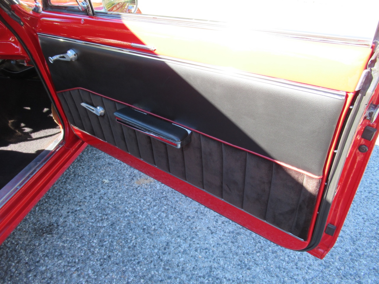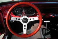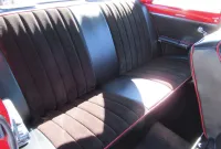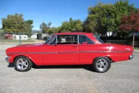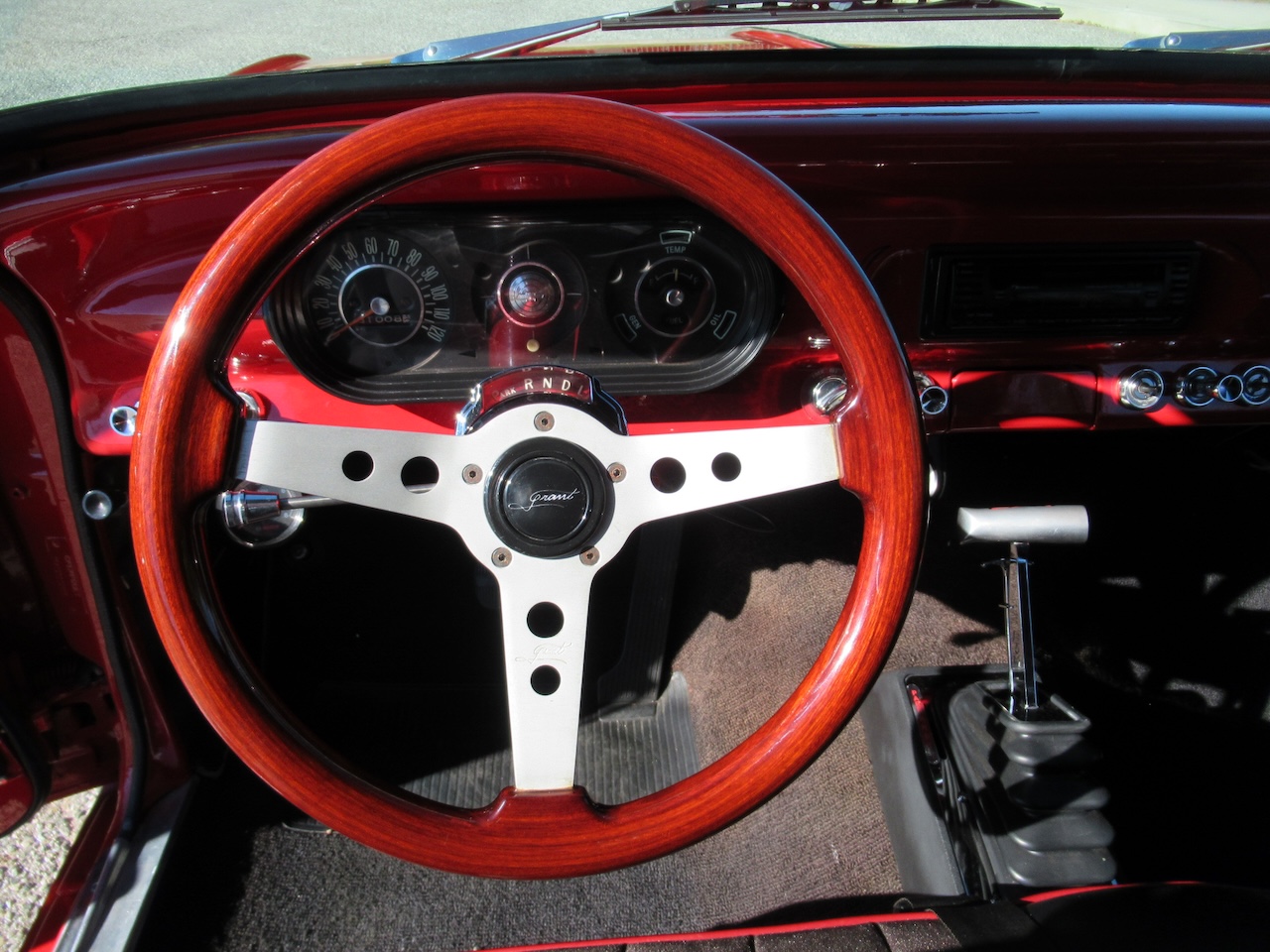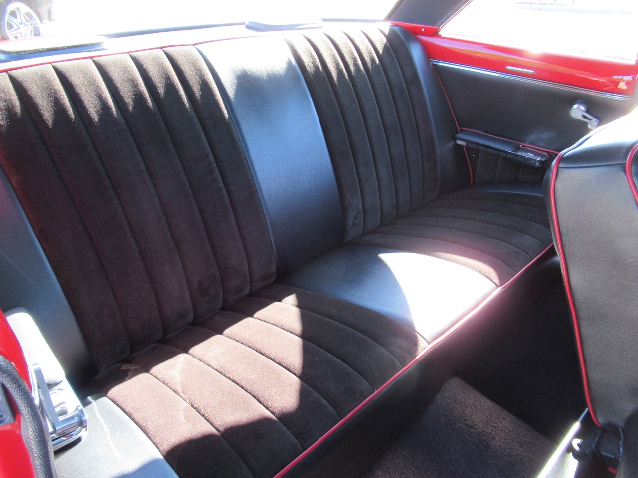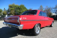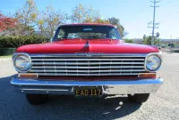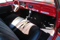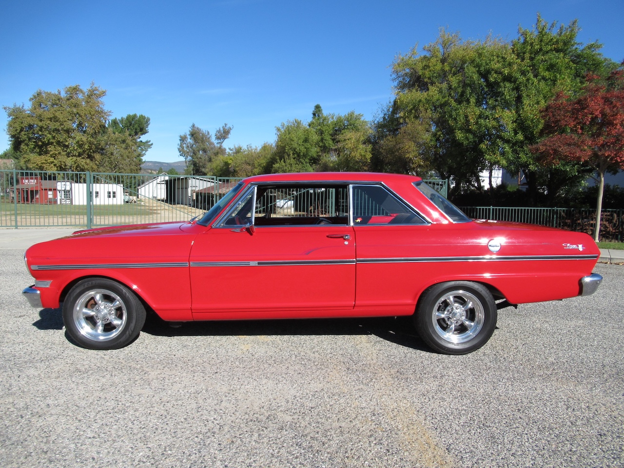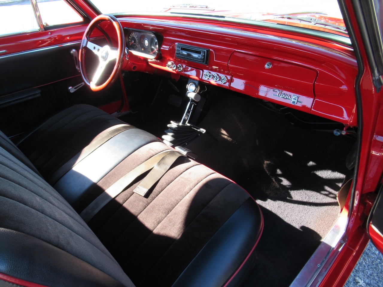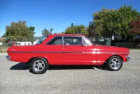 A nice bright Red Chevy Nova Sport Coupe! This local Black Plated California car was in the same family for the past 15 years and was restored a little over 25 years ago. It still looks great with some custom pinstriping, 15 inch polished American Racing wheels and an old school rake with newer springs and suspension components. Under the hood where that original little 6 cylinder sat is now and throaty 350 V8 with an Edelbrock Intake and 4 barrel carburetor, HEI ignition, oversized radiator, CPP close ratio power steering, front power disc brakes and a set of headers with dual Flowmaster exhaust to let them know this ain’t Grandma’s car! The power gets sent to the road through a rebuilt Turbo 350 Automatic transmission and ending with a 10 Bolt rear differential. The basic bench seat interior is covered in a Black vinyl with Red piping and comfortable cloth inserts as well as a Grant 3 spoke wood steering wheel, factory gauges with an added accurate under-dash temperature gauge, Nakamichi AM/FM CD Stereo and a B&M ratchet Shifter with reverse lock out for safety. A great looking affordable Muscle car that is a blast to drive!