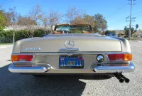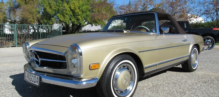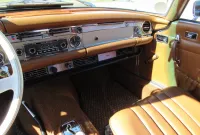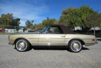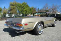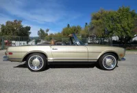 The 280SL is a class act and gets noticed and admired at every street corner! This original Blue plated California car is finished in a beautiful Tunis Beige Metallic and comes with a Dark Brown canvas Soft Top, removable Hard Top, the original 14 inch steel wheels with color matched wheel covers and a set of classic white wall radial tires. The chrome and and brightwork are in amazing condition and although it is a U.S. model it has a nice set of European Headlights which are a little brighter then the stock ones. Under the hood sits a recently rebuilt 2.8 Liter 6 cylinder fuel injected engine with less than 2k miles on it, 4 wheel power disc brakes, power steering and factory A/C with updated R134 Freon. The interior is finished in Cognac MB-Tex with bucket headrest seats, Vintage Coco mats, floor shifter, original Becker Europa AM/FM stereo and original steering wheel. The previous owner lovingly pampered this Pagoda for the last 25 years and it has a stack of service records to prove it. You are sure to be parked right in front if you valet this one!