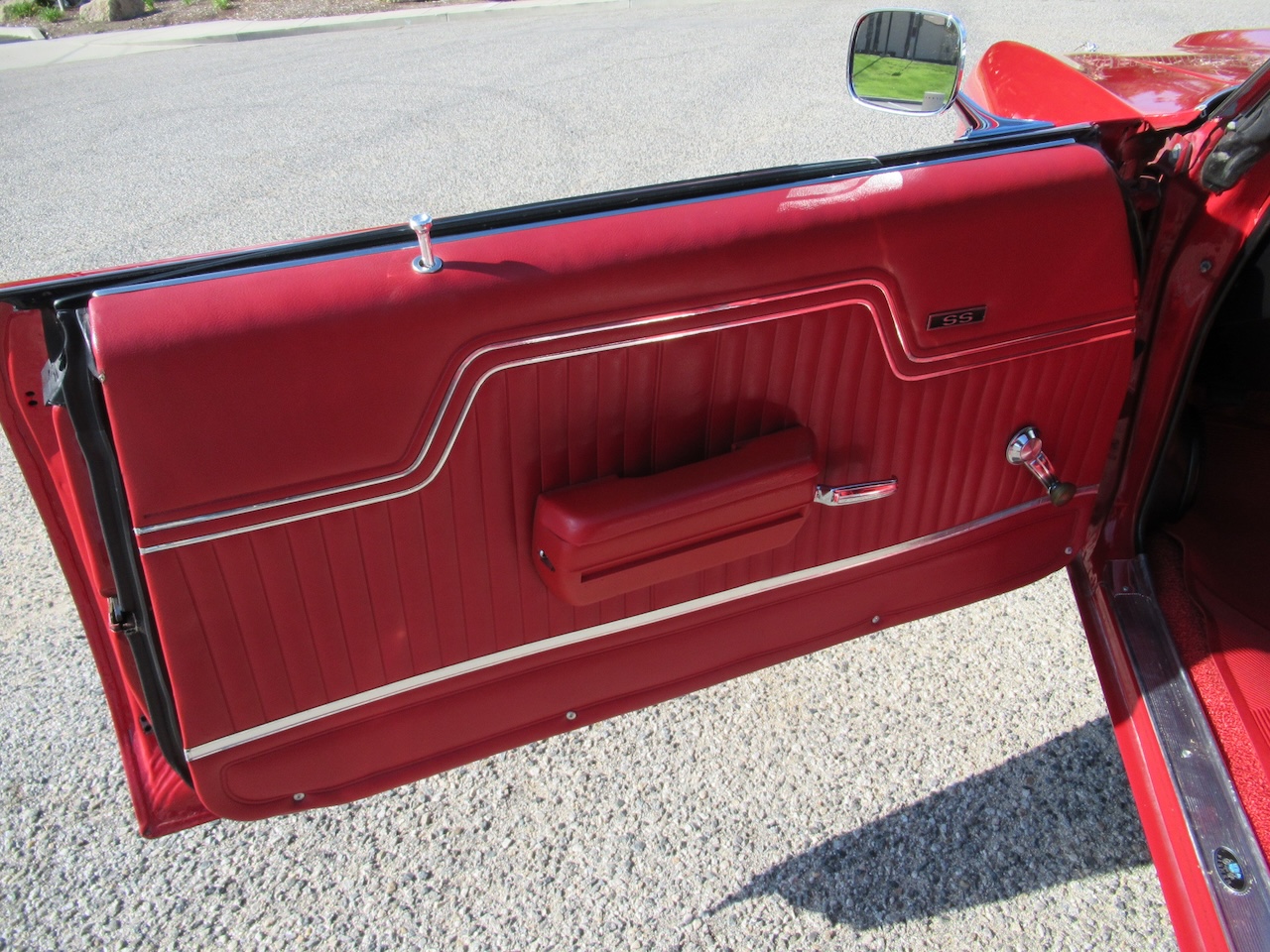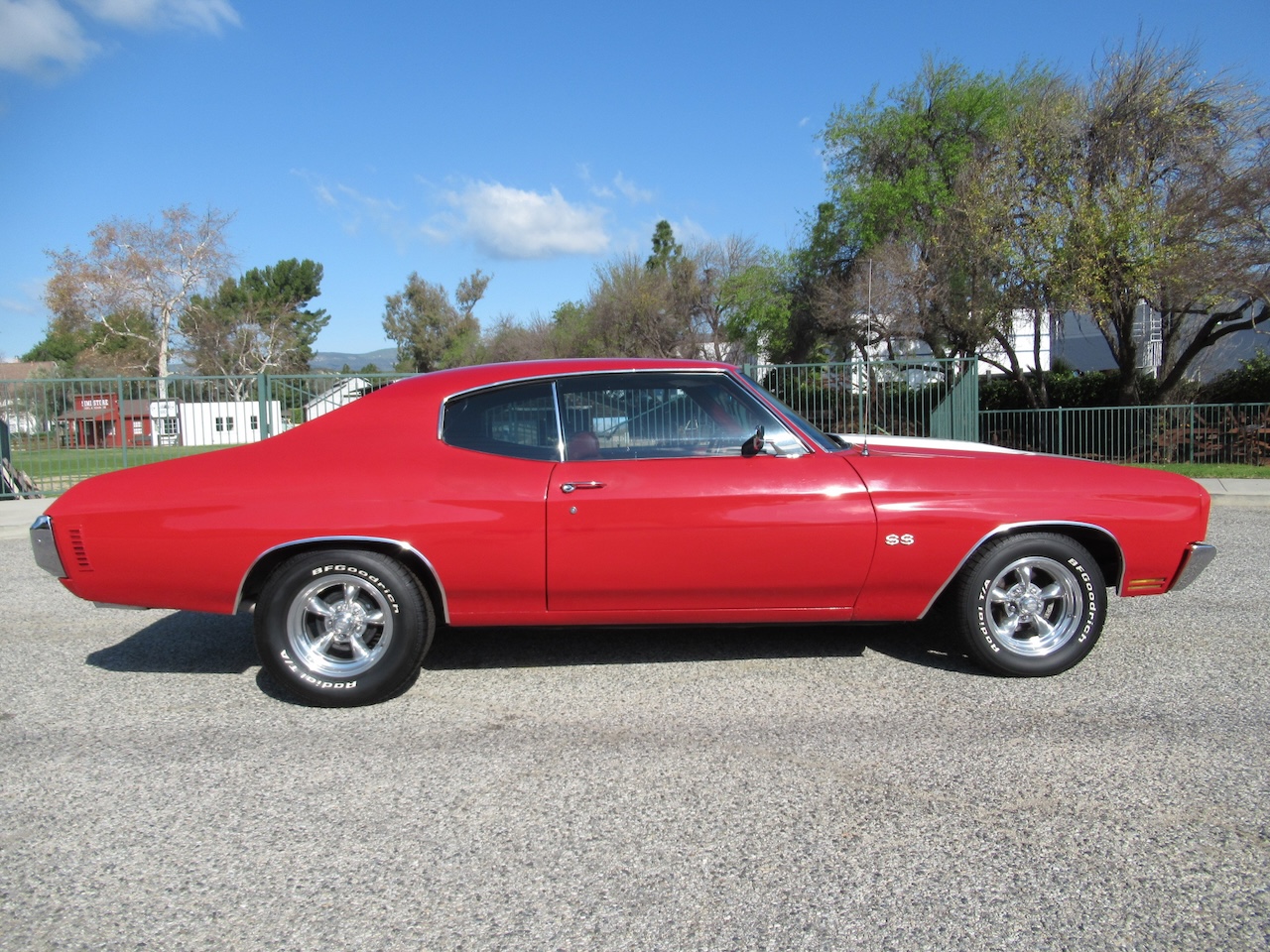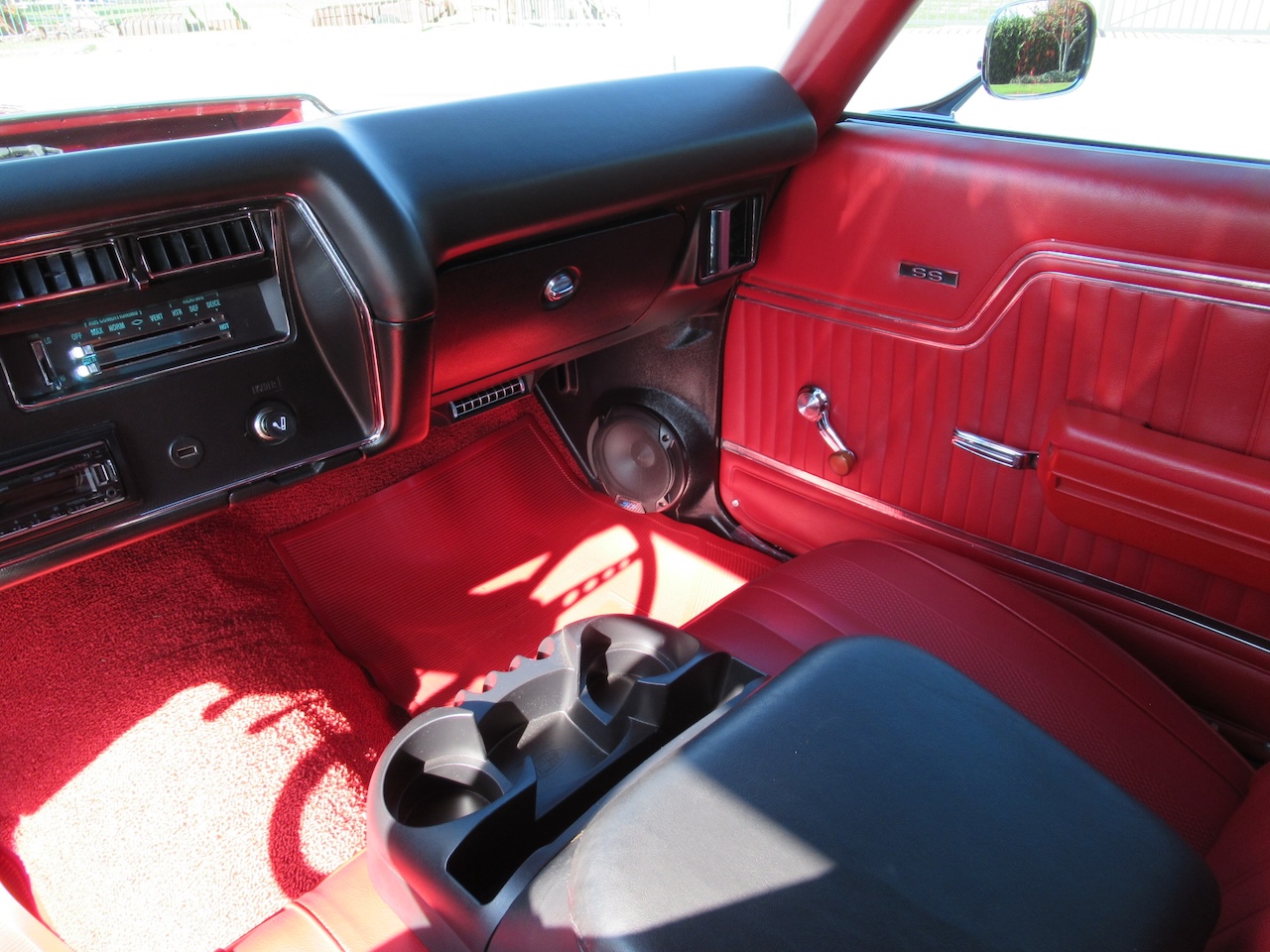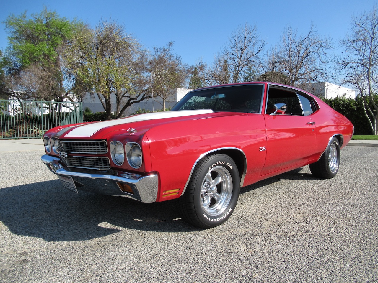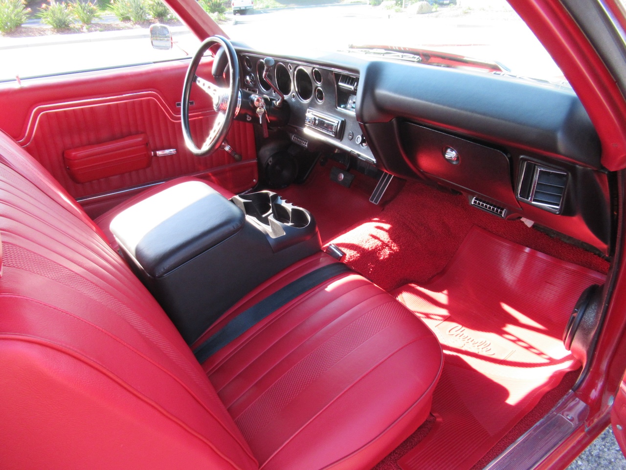 Check out this Cranberry Red Chevelle with a pair of White SS Stripes, Cowl Induction hood, New Chrome SS Bumpers, dual mirrors, tinted glass and a set of 15 inch polished American Racing Wheels wrapped in B.F. Goodrich Raised White Letter radials. Under the hood sits a 350/330 HP GM crate motor with chrome GM Valve covers, polished Edelbrock aluminum intake, Edelbrock 4 barrel carburetor, HEI ignition, Factory A/C with R134 conversion, power disc brakes, power steering, headers with dual exhaust and performance mufflers with some correct Chrome tips exiting out the rear. Power gets put to the road through a 700R4 4 speed automatic overdrive transmission followed by a freeway friendly 12 Bolt rear differential, front and rear sway bars and some upgraded tubular control arms up front to help with the handling. The Red vinyl interior is very nice with new Legendary Upholstery on the original bench seat, SS door panels, Dakota Digital gauge package in an SS style dash cluster, tilt steering column with custom 3 spoke steering wheel, Alpine AM/FM CD stereo with Bluetooth connectivity, kick panel speakers and a USB port for charging your devices. 1970 seems to be the most popular and noticed years of the Chevelle and prices seem to be soaring. Although this is not a restored show car it sure is much more affordable and just as much fun to drive!