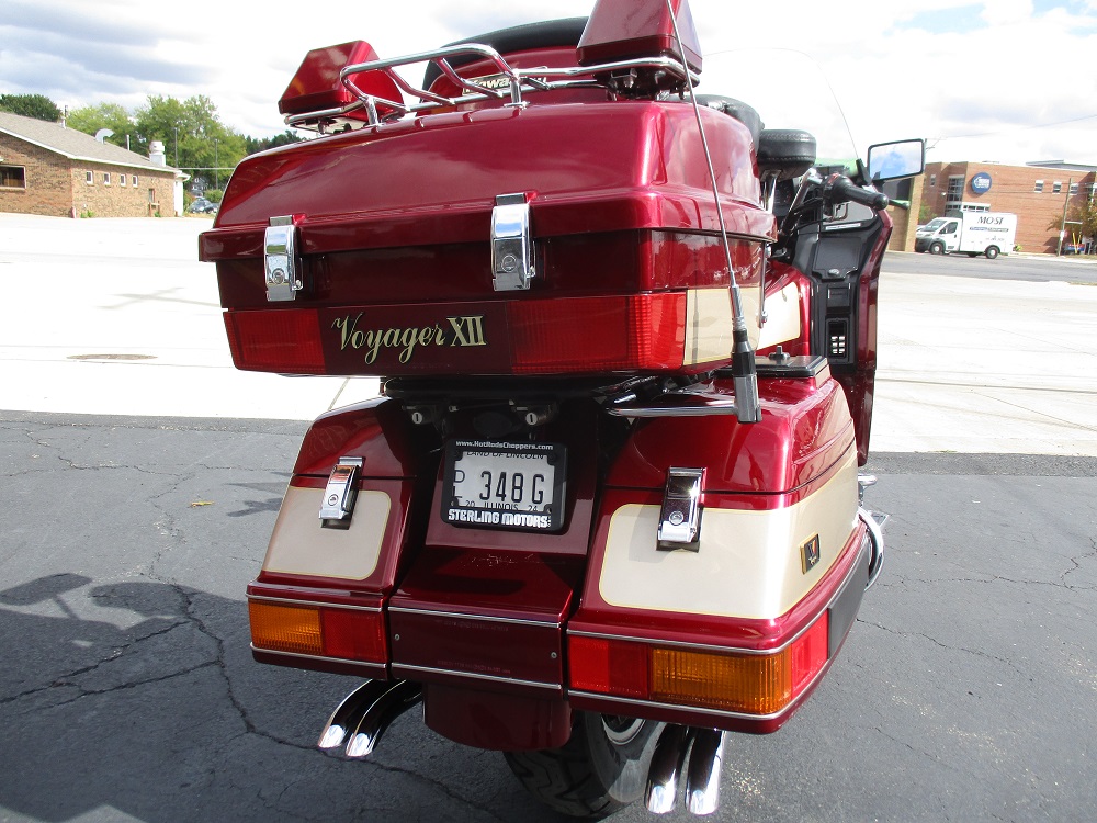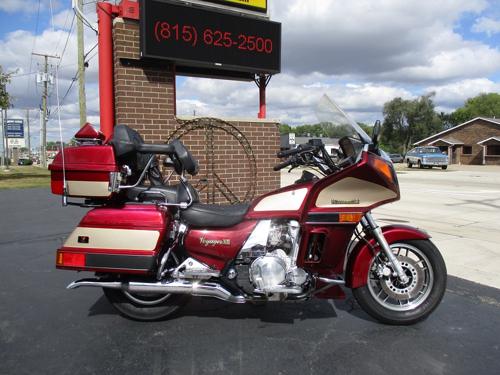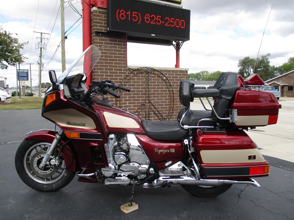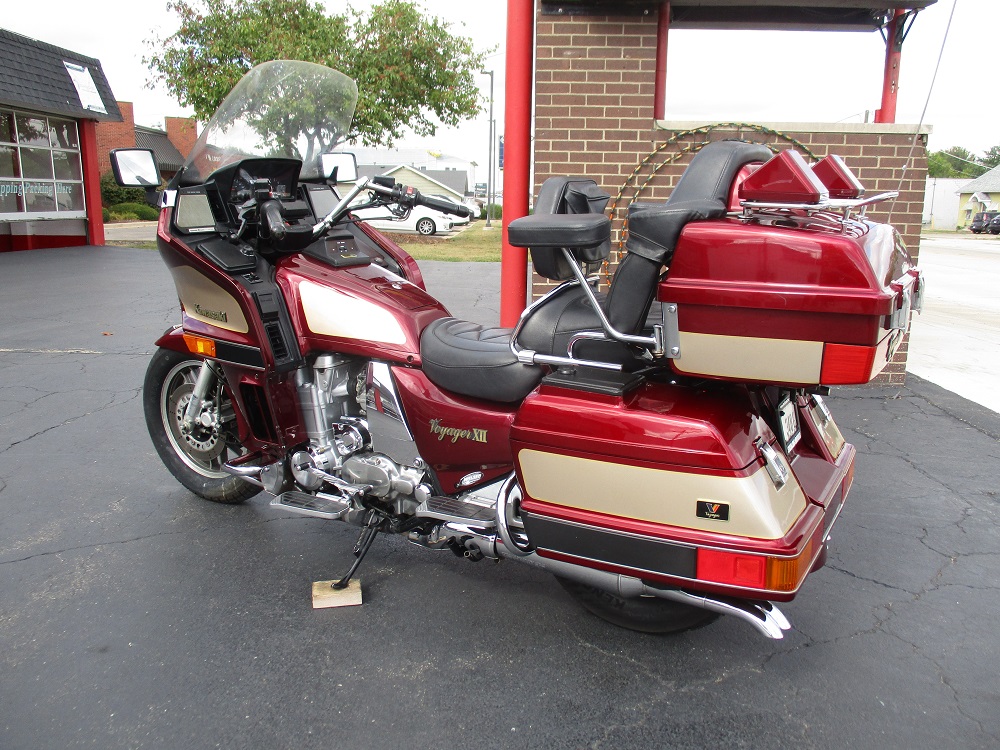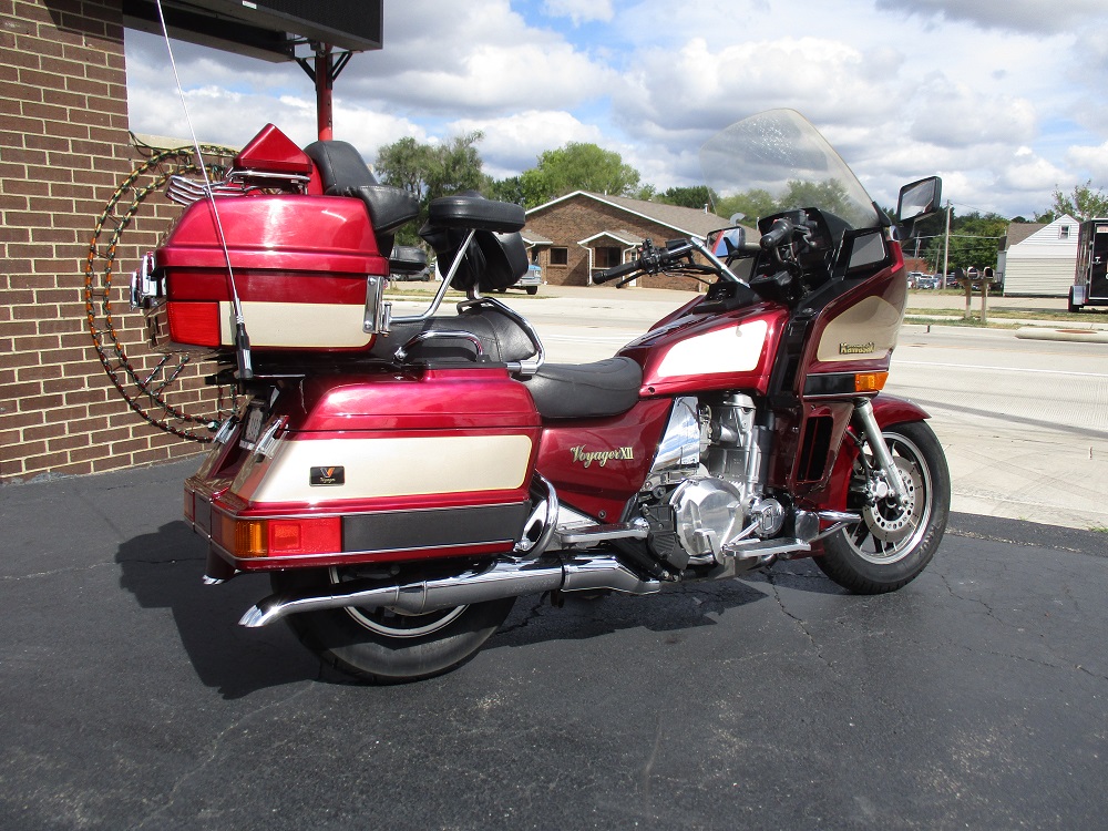 The Kawasaki Voyager debuted in 1986 as a fully dressed touring motorcycle, designed to rival Hondas Gold Wing with long-distance comfort, integrated luggage and advanced electronics. The 2001 Kawasaki Voyager XII (ZG1200) is a full-dress touring motorcycle powered by a 1,196cc liquid-cooled, inline-four engine with DOHC and four valves per cylinder. It uses a 5-speed transmission and shaft drive, has a large fairing, comfortable seating and weighs in with a wet weight of 799 lbs. This particular example was optioned in a gorgeous Vintage Red and Pearl Beige that still looks amazing. It has been nicely upgraded with a driver backrest that has a storage pouch in the rear, driver floor boards, a heel to toe shifter and it sounds amazing ripping through its true dual performance exhaust with dual tips on both sides. It was last serviced less than 1,000 miles ago at which time both tires were replaced. The previous owner was planning to change the brake pads but realized that the owner prior to him had just done it and they had too much life left to remove them. The 3 sets of new pads he was planning to install are included as well as the needed gaskets for the next service, the original toe shifter, a waterproof storage cover, the original color matched saddle bag and trunk liners with Voyager logos and the original owners manual for the bike and Clarion PK-9090V stereo system. The are few scratches here and there and there is some discoloration on the windshield but overall,