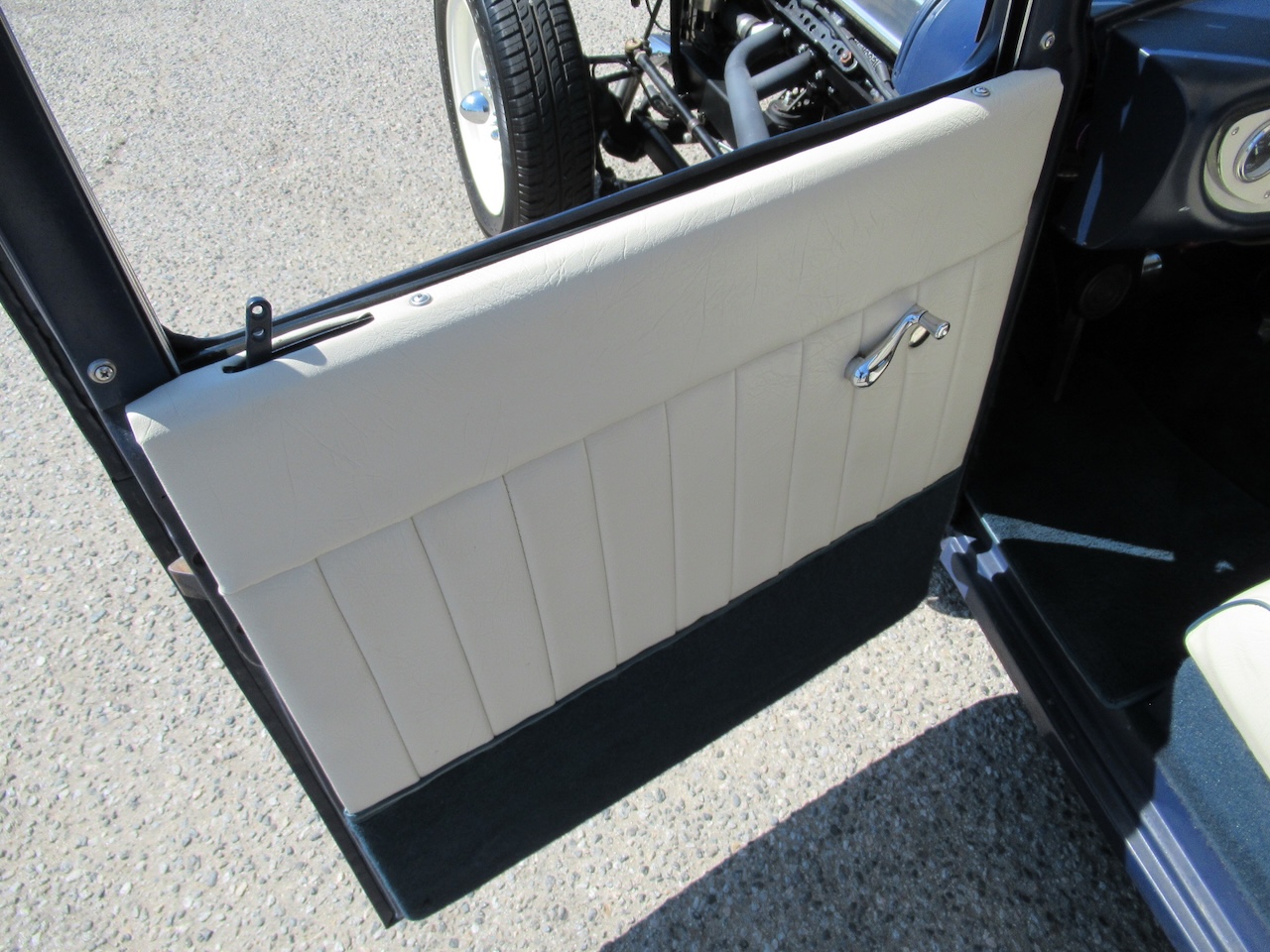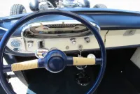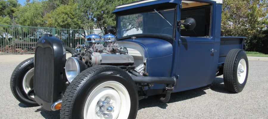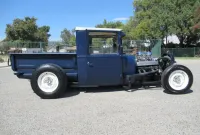 You probably won’t see another one like it! This Model A Pickup is exactly what guys used to build in the 50’s and 60’s. Painted in a Matte Blue finish with all of its bumps and bruises still there, Big Ford headlights, a wood bed with relocated Barrel style fuel tank under it, battery access panel and a little added clearance for the rear differential. The 15 inch skinny steel wheels are painted a cream color with Chrome center caps and a wood framed ratty canvas soft top to let the light in. The exposed powerplant is a 401 Buick Nailhead V8 with an Offenhauser aluminum dual quad intake with a couple of Carter AFB 4 barrels on top, Chrome dome air cleaners, Finned aluminum Offenhauser valve covers, aluminum radiator with overflow catch can, electric fan, Lake style headers with block off plates and a set of Smithy tube mufflers with turn downs. The Turbo 400 transmission shifts properly and is followed by a 57 Chevy rear differential with some freeway friendly gears. The interior is finished in White vinyl with Blue piping, Custom 1958 Rambler dash board, Early Ford style steering wheel, Moon Eyes tachometer, Lokar Floor shifter, glovebox mounted AM/FM CD stereo with Aux and USB, pop out tilt windshield, electric wiper and dual hinge mounted mirrors. The suspension consist of 36 Ford Rear radius rods, custom fabbed frame with 10 inch kickup, a dropped A front axle with split A radius rods and some front disc brakes to stop this crazy contraption. This car was built to drive and turns a lot of heads but if you are over 5 foot 8 inches you won’t fit, no legroom in this one!